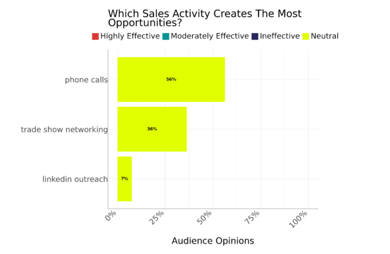 With all opinions about which sales activity creates the most opportunities being neutral, it’s evident that there’s no one clear preference. However, our audience did discuss specific activities more than others, with phone calls leading the way at 56%, followed by trade show networking (36%), and LinkedIn outreach (7%). The focus on phone calls tracks, with current trends confirming that for sales professionals, 41% still consider phone outreach the most effective lead generation channel.