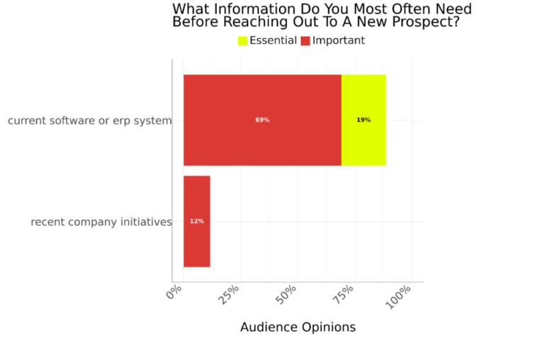 69% of ERP channel partners or value added resellers say that having information about a new prospect’s current software or ERP system is important, while 19% say this information is essential. Information on recent company initiatives is also rated as important by 12%, reinforcing how understanding a prospect’s technology environment and business priorities allows partners to tailor their approach, demonstrate relevant value, and build stronger, more strategic client relationships.