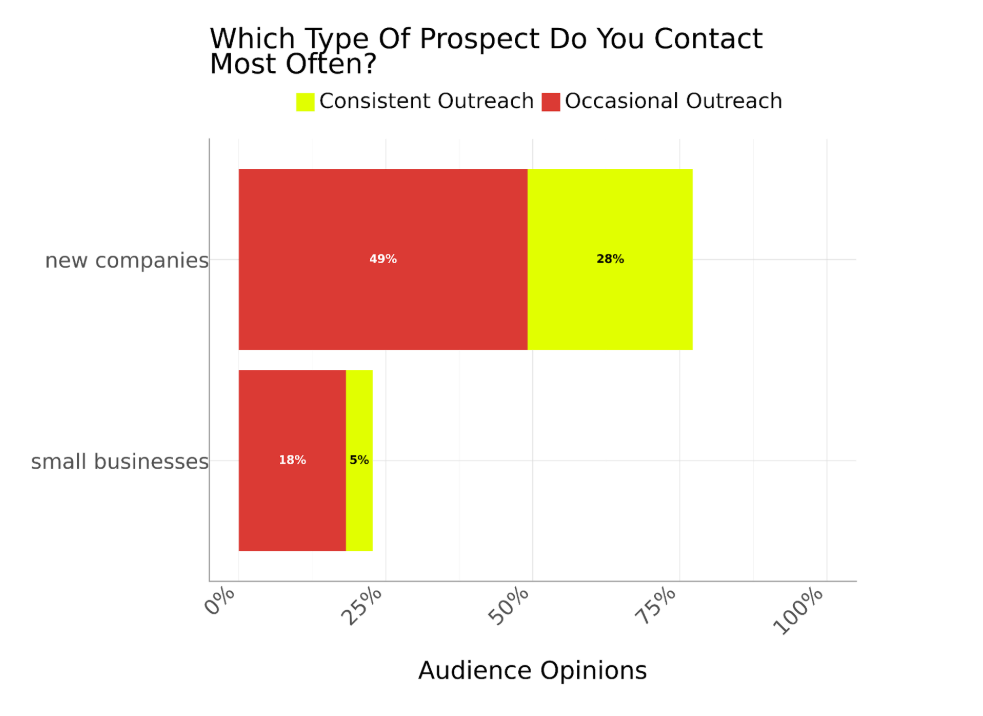 New companies are clearly the preferred type of prospect for our audience, with 28% doing consistent outreach and 49% doing outreach occasionally. Small businesses are far behind, with only 5% doing constant outreach and 18% doing so occasionally.