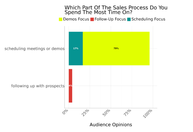 Although only 23% of our audience said that product demos were the most effective type of content for attracting leads, 79% say that focusing on demos is the part of the sales process that takes the most time. Scheduling meetings is the most time-consuming for 17%, and only 4% say that it’s following up with prospects.