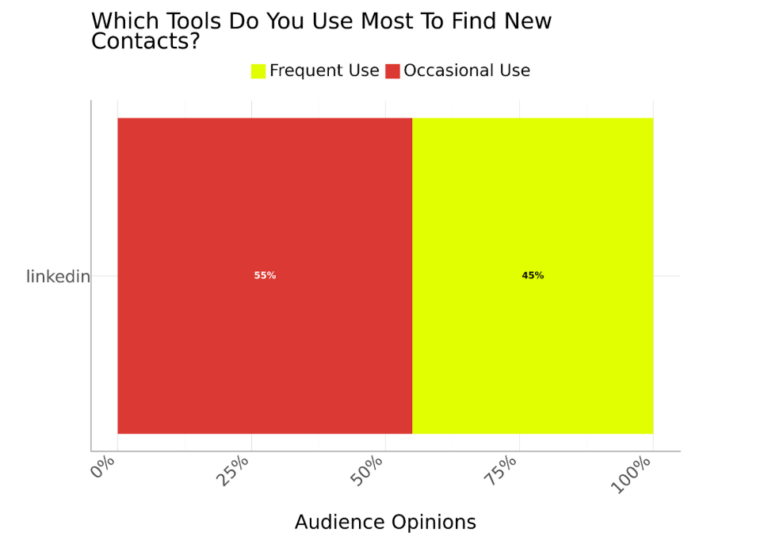 LinkedIn’s effectiveness lies in its professional focus and its advanced targeting tools, credibility-driven environment, and content-based engagement make it ideal for building trust and nurturing relationships that convert into real business opportunities. Our audience clearly finds it effective too, with 100% stating that it’s the tool they use most to find new contacts, split into 45% who use it frequently and 55% who do so occasionally.